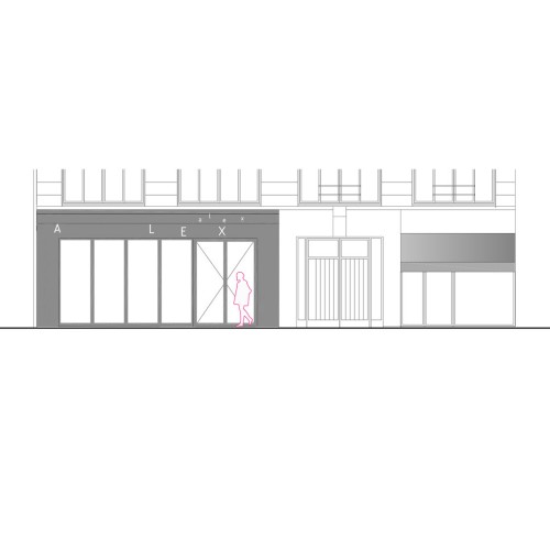 A trader has a project: transforming its grocery products into a restaurant. The idea is to expose the existing structure and walls and to create a furniture from the back of the store to the showcase. The bar, sanitary and kitchen will be blended into the furniture. The main idea is to bring the light and enjoy the depth of the trade. The budget is tight, so the electrical network will pass through visible ducts, walls will be exposed. The project will but unfortunately not done in the presented form. It will remain : the management by architect of technical, regulatory and urban regulations.